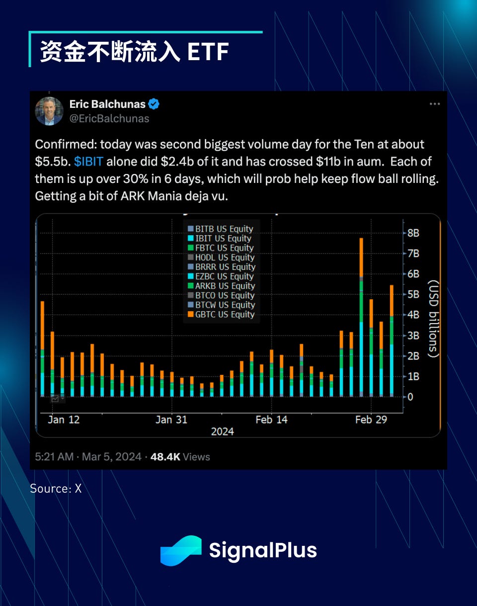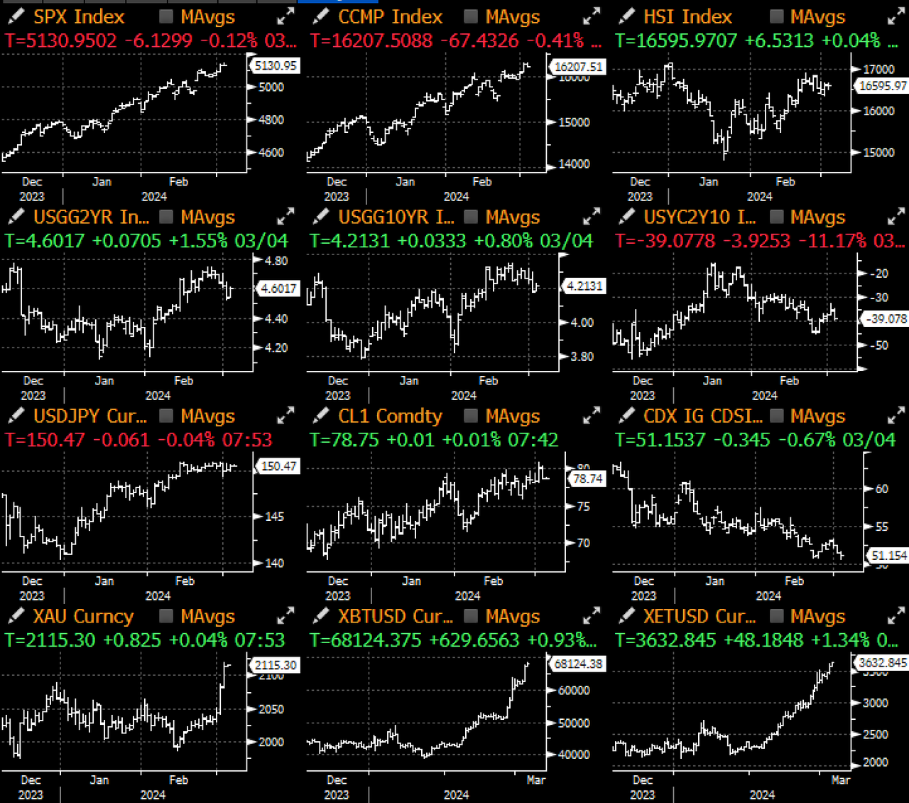 傳統金融市場昨天處於區間震盪,股市在近期區間內盤整,但由於企業債供應增加,整體殖利率曲線走高。 Powell 即將於週三/週四赴國會作證,企業紛紛急於在本週的前兩天進行債券發行, 48 小時內預計將有 300–350 億美元的債券完成定價。 昨天主要的消息來自亞特蘭大聯邦儲備銀行Bostic,他在一篇文章中表達了擔憂,認為降息可能會釋放新的需求,從而加劇價格壓力,他在問答中進一步表示,預計「首次降息後可能會暫時按兵不動, 以評估影響…希望能夠盡可能保持當前縮表速度」。