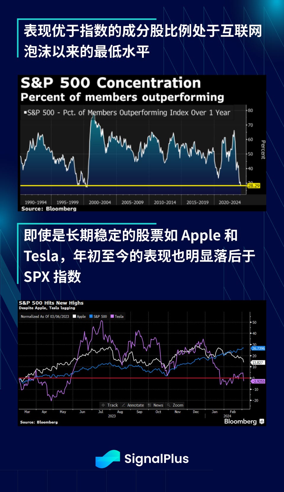在股票方面,沒有特別引人注目的消息,不過Bloomberg 指出,SPX 表現的集中度已達到歷史極端水平,表現優於指數的成分股比例處於互聯網泡沫以來的最低水平,換句話說,SPX 指數的 上漲完全是由少數股票(例如Nvidia)所推動的,即使是長期穩定的股票如Apple 和Tesla,年初至今的表現也落後於指數。