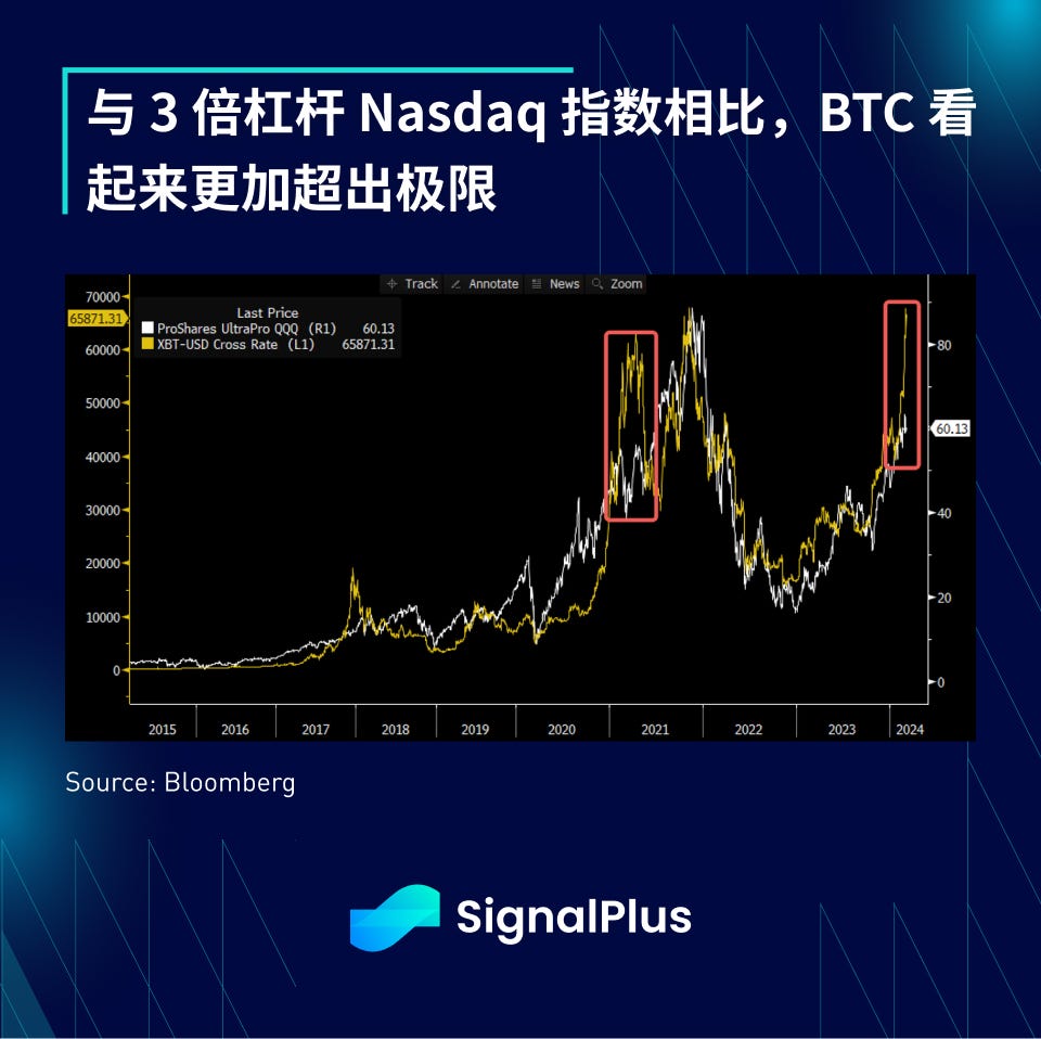 从昨天 BTC 价格的快速恢复可以看出,市场仍处于逢低买入的模式,然而,考虑到 BTC 相对 ETH 和其他 altcoins 的突出表现,BTC 有机会从现在开始表现落后,如果将 BTC 与 3 倍杠杆 Nasdaq 指数相比,BTC 看起来也相对过度,短期内 BTC 有机会进入震荡盘整模式而表现相对较差。