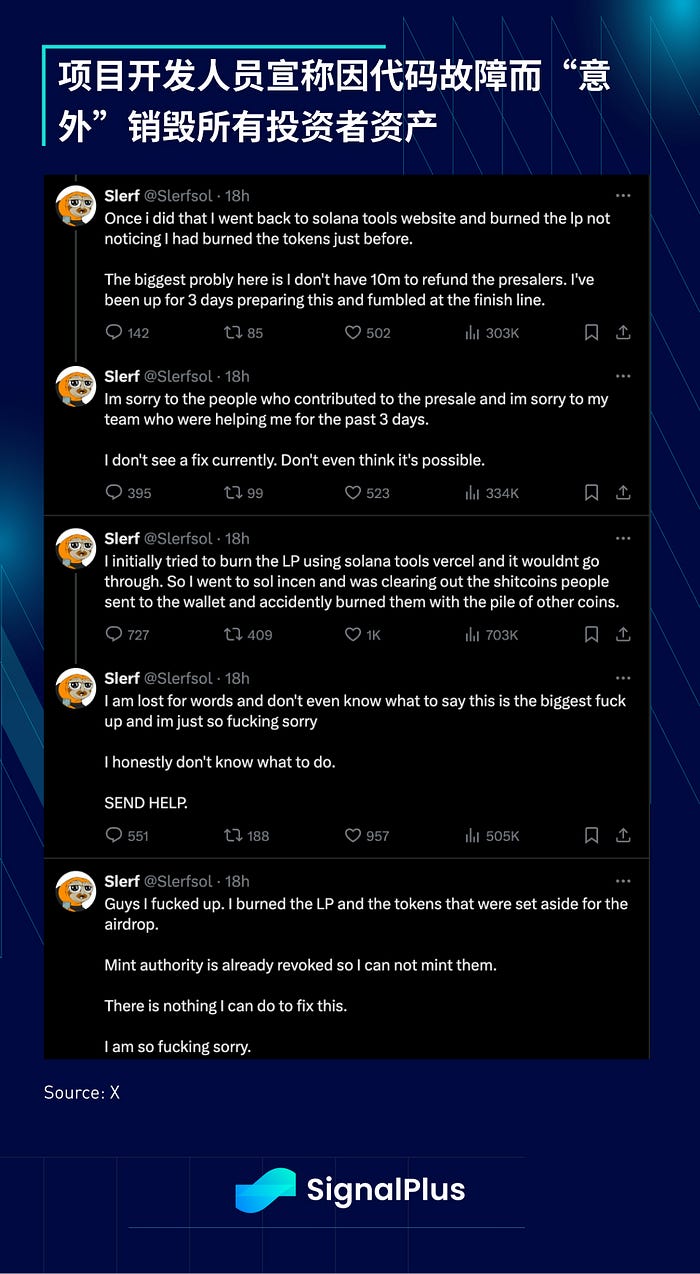 最后,没有什么比 rug-pull 更适合作为 meme 狂热时期的插曲,一个热门代币项目的开发人员在代币推出之前因代码故障“意外”销毁了 1, 000 万(美元等值)投资者锁定资产,正如我们上周提到的,情况看起来的确有点过于美好,暂时采取更为防御的立场可能较为明智,大家注意安全,好好保护宝贵的资产!