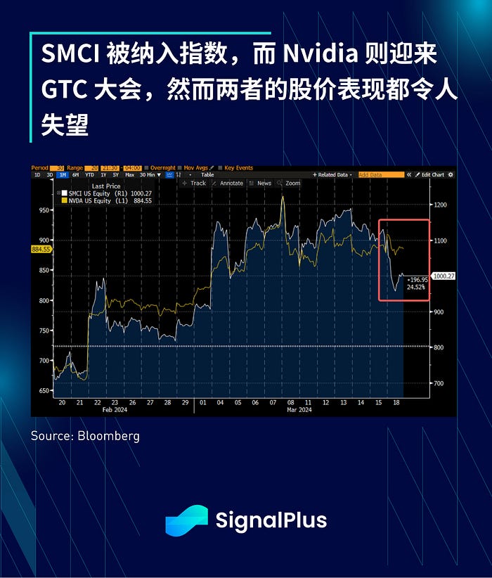 經歷上週五的下跌後,股市在周一再度反彈,隨著SMCI 被納入S&P 500 指數,以及Nvidia 備受期待的GTC 2024 活動開始,AI 熱潮再次升溫,不過兩者的開端並不吉利,由於利多 兌現,SMCI 當天下跌了3.5% ,而儘管Nvidia 宣布了另一款新晶片(Blackwell),股價還是從高點經歷了6 % 的跌幅。