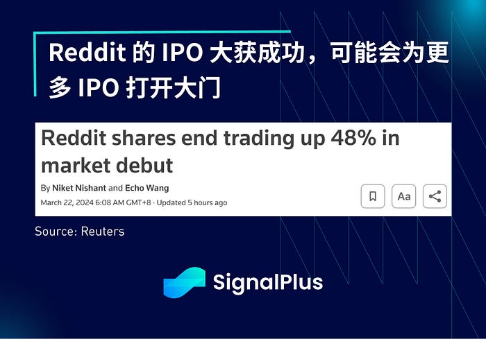 股市方面,S&P 500 指數連續 4 日上漲,再創歷史新高,儘管 Apple 股價因美國司法部起訴 iPhone 違反反壟斷法而下跌 4% ,但不影響指數上漲。 另一方面,隨著投資者看好其為AI 模型提供大量訓練數據的願景,Reddit 上市首日股價較發行價一度飆升了67% 以上,最終收漲48% ,這次IPO 的成功可能會為一 大批希望在市場情緒高漲的情況下上市的私人企業打開大門。