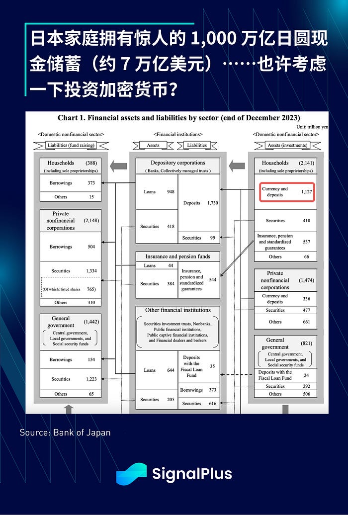 此外,日本央行最新的貨幣調查也顯示出一些有趣的信息,日本家庭在現金和儲蓄帳戶持有驚人的1, 000 萬億日圓(約7 萬億美元),約佔家庭金融資產的53% , 遠高於美國(13% )和歐洲(36% )。 此外,中等家庭的股票投資價值年增約 30% , 1/10 的家庭透過資本利得獲得超過 600 萬日圓的收入,相當於家庭全年收入。 隨著人們對股票投資、購買房地產、工資通膨(33 年來最大的工會工資漲幅)、退出負利率政策以及持續的世代財富轉移的態度終於發生了變化,他們將如何使用7 兆美元現金盈餘, 將是未來幾年最重要的宏觀敘事之一,他們是否有可能對加密貨幣多樣化投資產生興趣?