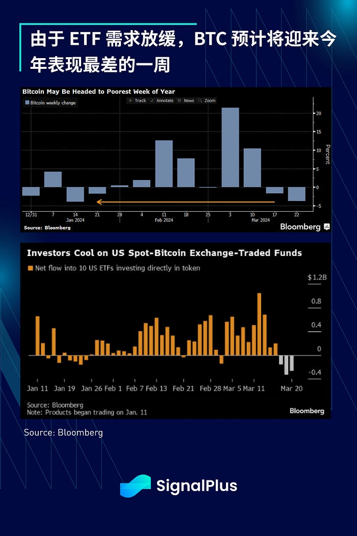 在加密貨幣方面,隨著 ETF 需求放緩,BTC 正朝著今年表現最差的一周邁進,市場基調略顯黯淡。 在 3 月中旬創下一系列單日流入紀錄後,BTC ETF 過去 3–4 天的淨流入明顯轉負,同時 BTC 價格動能放緩,使得 BTC 僅勉強維持在 6.5 萬美元以上。