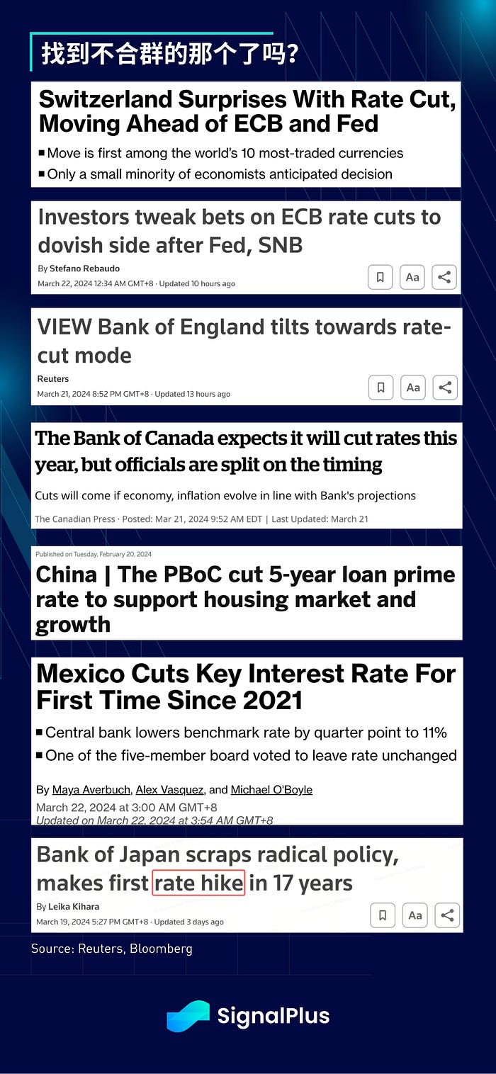 繼昨天聯準會表態其鴿派立場之後,瑞士央行意外成為首個降息的主要央行,這可能標誌著已開發經濟體進入降息年的開始。 英國央行緊隨其後,以8 比1 的投票結果實現了自己的“鴿派維持”,委員會預計CPI 將“略弱於”預期,而英國央行6 月降息的可能性也從65% 上升至 80% 。 在聯準會、英國央行和瑞士央行發布立場後,歐洲央行 6 月降息的可能性也接近 80% ,而鑑於經濟成長乏力,加拿大央行和中國人民銀行也明顯傾向寬鬆立場。