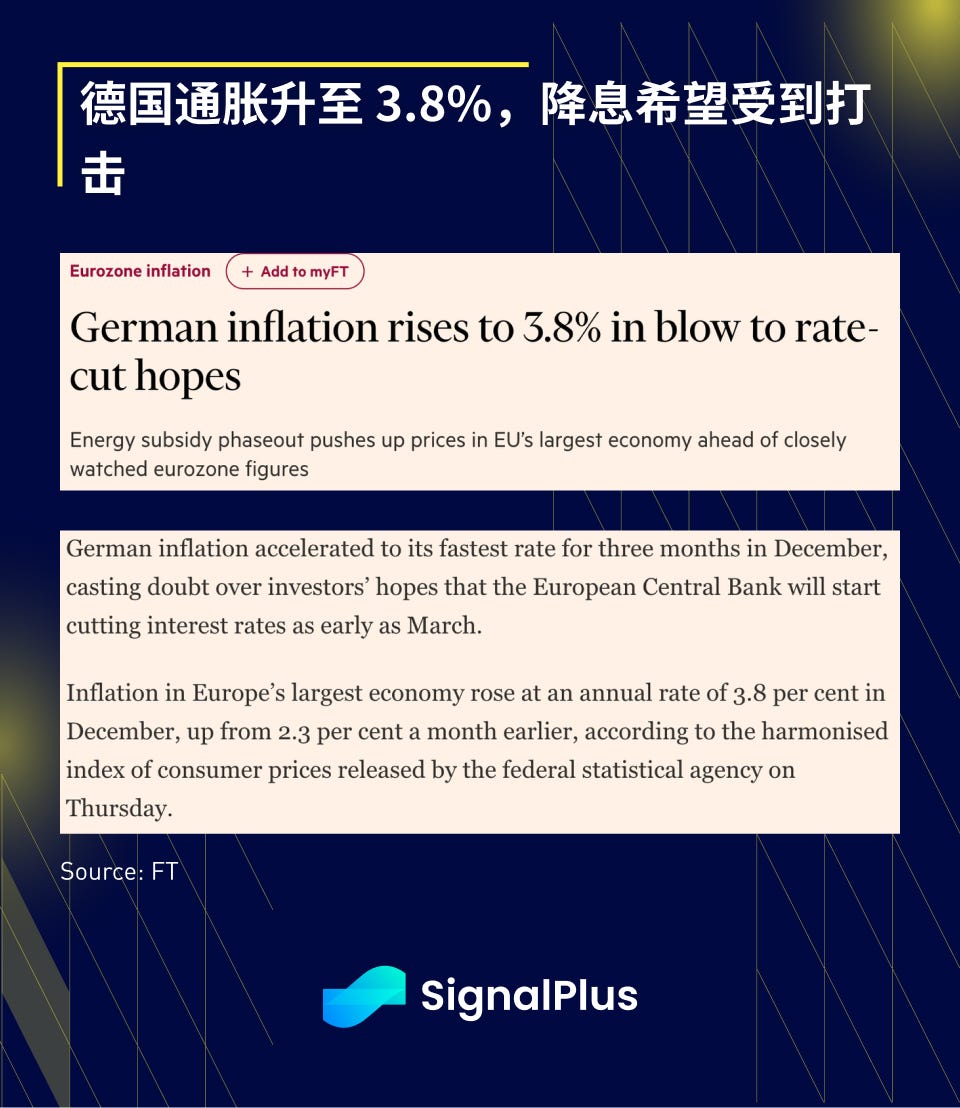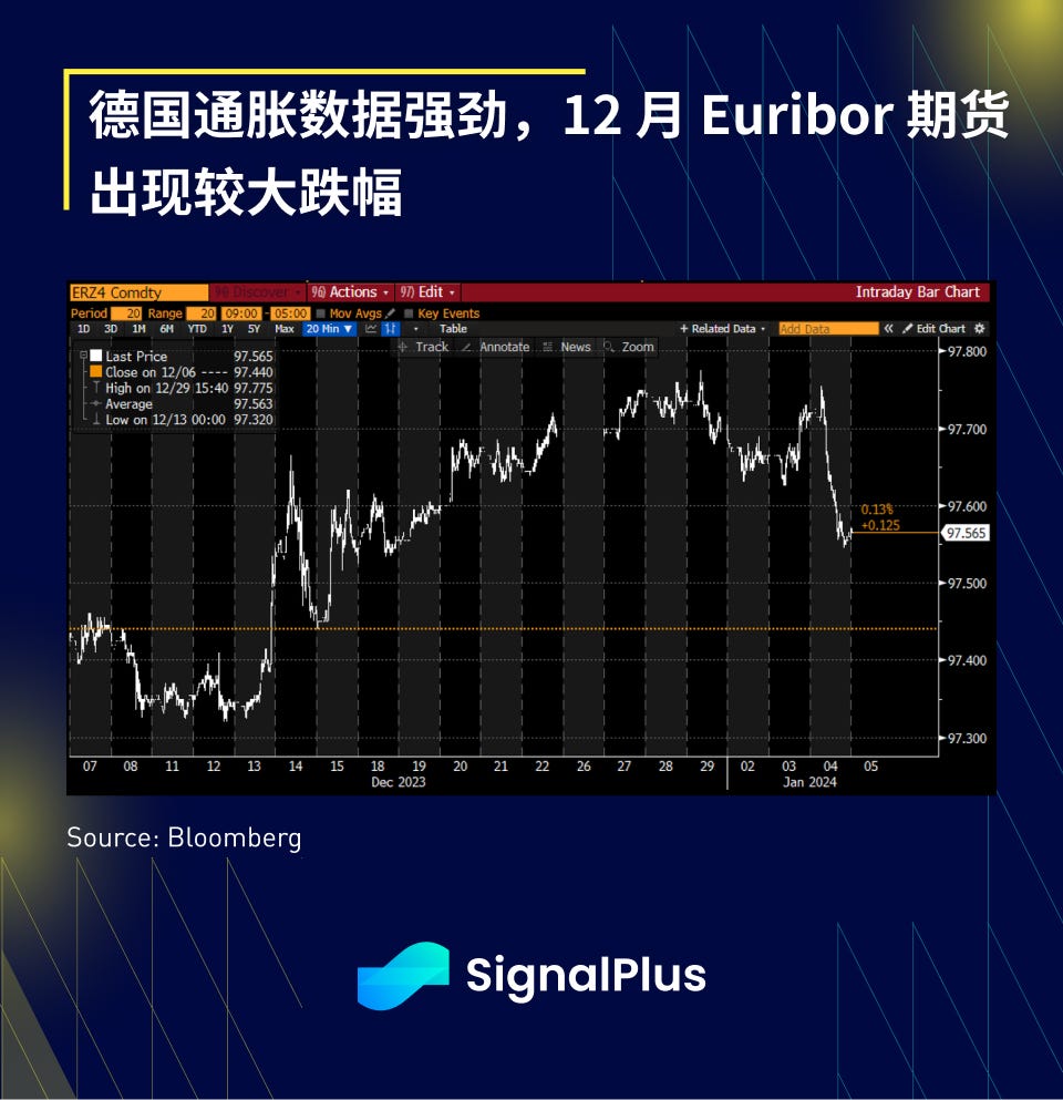 避险情绪连续三天升温,对欧洲降息的期待因德国通胀小幅回升而被推迟,物价上涨速度为 3 个月来最快,欧洲央行 3 月降息的可能性回落至 43% 以下,12 月 Euribor 期货下跌 14 个点,创近 6 个月来最大跌幅。
