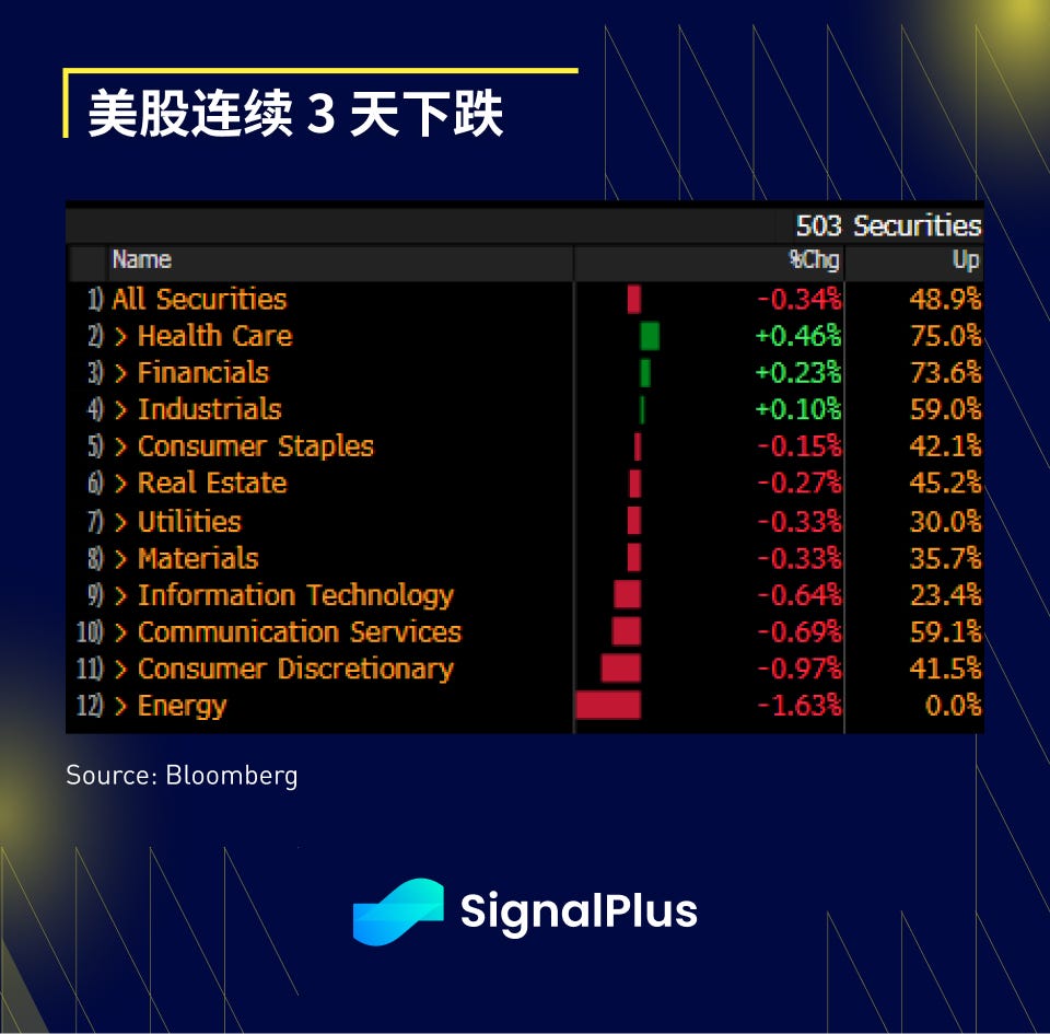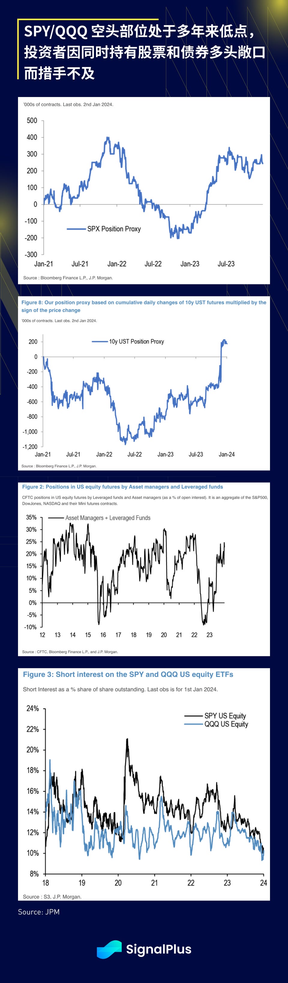 股市表现仍疲软,能源和大型科技股轮流拖累指数走跌,由于投资者预期央行降息潮即将到来,SPY 和 QQQ ETF 的做空兴趣处于多年来的最低水平,投资者也没有意愿进行任何下行保护,同时持有股票和债券多头头寸在这波走势中较为不利。如果非农业就业数据和 CPI 走强,可能会引发风险资产进一步的下跌,届时可能会有更多投资者进行逢低买进的操作。