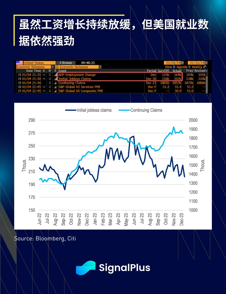 美国方面,ADP 就业人数增长超出预期,加上初请失业救济人数保持稳定,进一步增加市场对今天非农就业数据走强的预期,ADP 数据中的服务业、休闲和酒店业增长较为强劲,另一方面,工资增长持续放缓,跳槽者工资增长从 8.3% 下降至 8.0%,而在职者工资增长也从 5.6% 降至 5.4%。