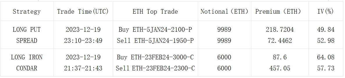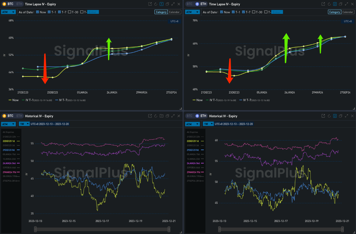 数字货币方面,BTC 价格在昨天收盘后小幅回落至 42000 美元,而后逐渐收复几乎全部失地,接近平收(-0.3% )。期权方面,BTC/ETH 两者的前端隐含波动率再度下调,后端微涨,曲线整体走陡,且受到市场对一月初 SEC 可能批准 BTC ETF 的决策影响,BTC 的 ATM Vol 在 12 Jan 24 上维持了期限局部高点。交易方面,BTC 12 月到期的平值看涨期权遭到大量抛售,同时 12 Jan 和 26 Jan Wing 上的 Call 持续得到买入,部分解释了今天 IV Curve 走陡的现象;ETH 5 Jan 上单腿接近 10000 ETH 的 1950 vs 2100 Long Put Spread 成交吸引了市场注意,为年初价格可能的下行波动做出保护。