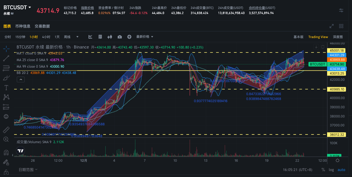 数字货币方面,BTC 延续着上行之势,多次挑战 44000 美元关口。期权方面,受今晚多组宏观数据公布的部分影响,末日期权 IV 强势升高,BTC/ETH 当前分别达到 50% /60% 的水平,另一方面,ETH ETF 明年或将上线的传闻在消息圈里愈传愈烈,可能是今日其中远端 IV 抬升 2% Vol,Vol Skew 也明显上涨的支撑信念之一。