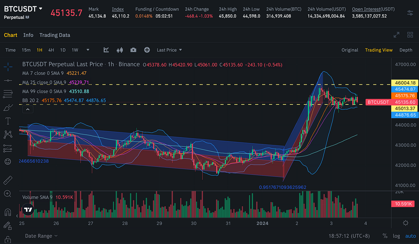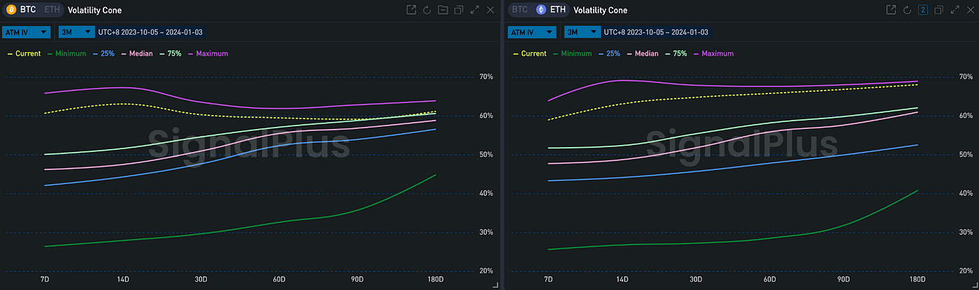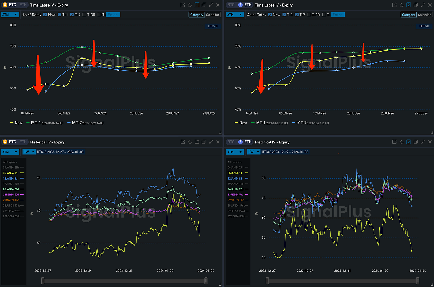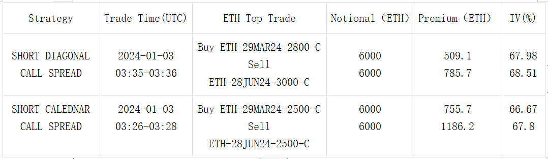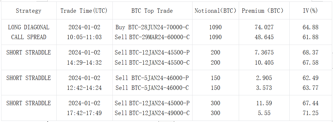 数字货币方面,BTC 自 2022 年底以来首次突破 45000 美元,并一度挑战 46000 美元关口。期权隐含波动率一度飙升,但随着价格逐渐稳定在 45000 上方后,IV 整体水平有所回落,BTC 前端出现大量以 Short Straddle/Strangle 为代表的大宗看跌波动率策略;另一方面,IV Surface 在 12 JAN 24 处形成较为陡峭的坡面,表达出市场对 ETF 批准的期待。在交易上, 3 月 vs 6 月的看涨(三角)价差策略成为焦点,其中 BTC 上以卖 29 MAR 24–60000-C 买 28 JUN 24–70000-C 为代表,单腿数量超过 1000 BTC;ETH 的成交方向在期限上相反,主要是在三月买入,六月卖出。