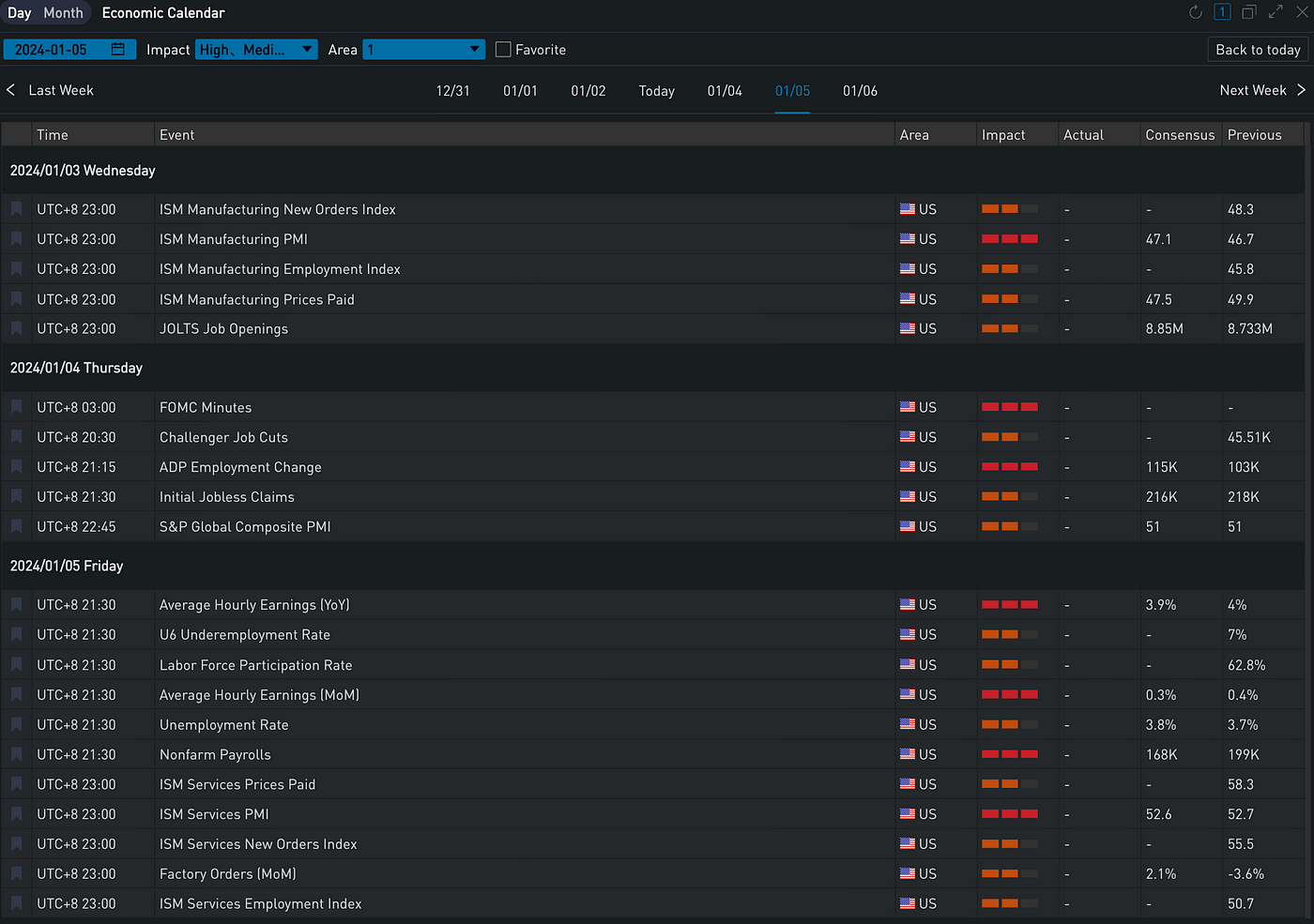 昨日(2 JAN)交易员对美联储降息的信息有所动摇, 3 月开始实施宽松政策的可能性从上周的 85% 降至 75% ,同时减少了对降息幅度的押注,预计今年累计降息幅度不会超过 150 个基点;固定收益市场交易活跃,美债收益率全线上涨,十年期收益率现报 3.976% ,创两周新高,两年期收益率报 4.347% 。美股方面,因遭到巴克莱下调评级的影响,苹果及一众芯片股均出现跌势,加之市场对美联储降息预期的削减,三大股指走势分化,其中道指平收(+ 0.07% ),纳指和标普 500 分别收跌 1.6% /0.57% 。另一方面,美国 12 月 Markit 制造业 PMI 录得 47.9 ,低于预期的 48.4 ,据金十报道,标普全球发文表示:随着美国制造业订单数量以更快的速度下降,产出再次收缩,且制造业就业人数下降速度为 2020 年 6 月来最快。本周将是数据发布相对密集,将包括周三的 ISM,JOLTS,周四的初请失业金人数,以及周五的 ISM 服务业和非农就业数据等。