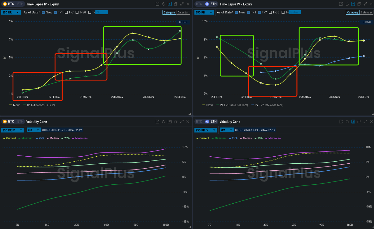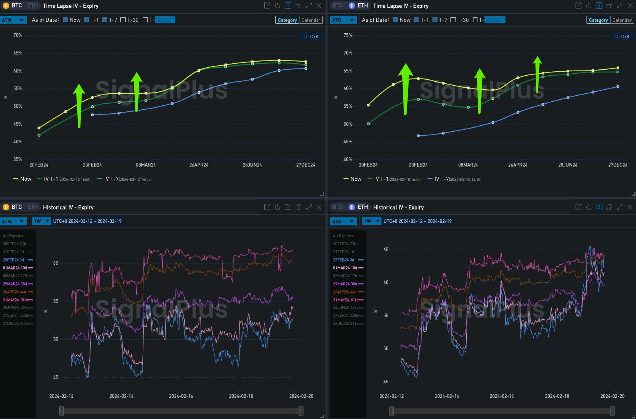 数字货币方面,BTC 在达到 52000 附近后已经连续 4 天停滞不前,ETH 则在加密行业预计其 ETF 将在五月获批的利好传闻中再度上行突破 2900 点,自此 ETH 今年的涨幅已经超过 BTC 约 3.8% 左右,期权方面的差别更为明显,ETH 整体隐含波动率水平达到 60% 以上,曲面较平,中前端高出 BTC 4–9% Vol;从 Vol Smile 的斜率上看,ETH 前端的 Call 仍保持着较高的 Vol Premium,三月往后的 Skew 和 BTC 一同维持在近三个月的历史高点。