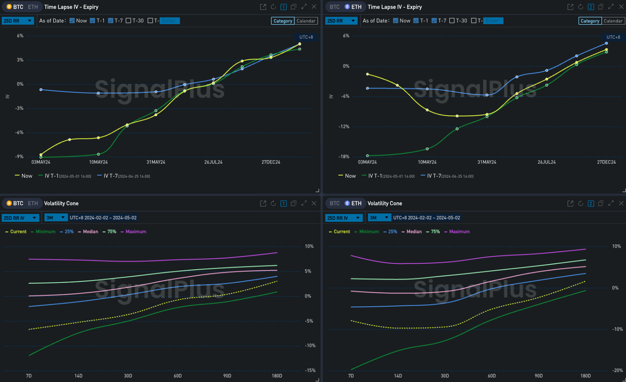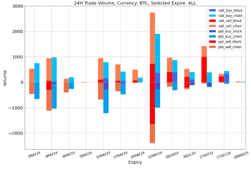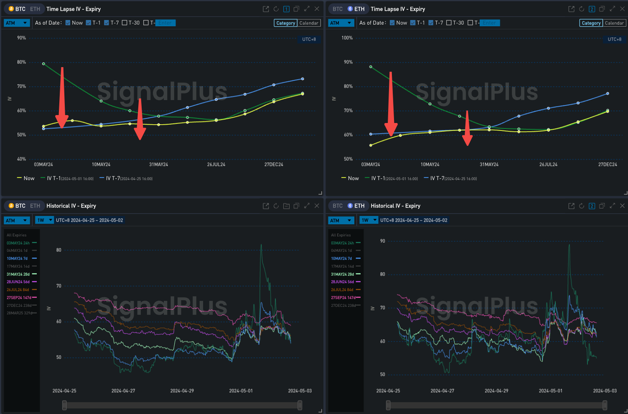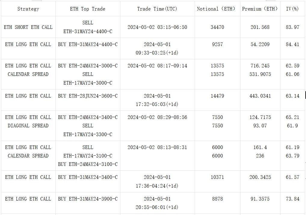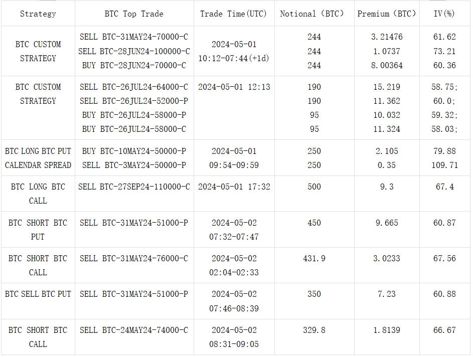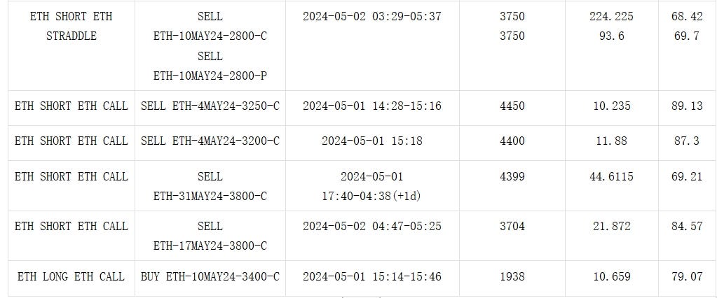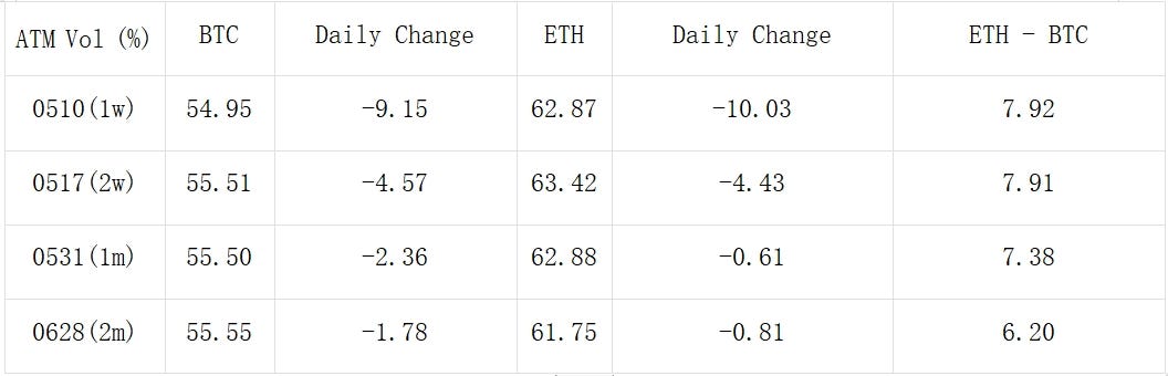 聯準會會議過後,選擇權前端的 IV 在日內快速下降,期限波動率曲線較平;近端的 Skew 依然偏低,表露出了市場短期的恐慌避險情緒。 交易方面,BTC 31 MAY 的隱含波動率水準在Put 和Call 的雙重拋壓下走低,ETH 主要成交則更加集中地分佈在該到期日上,從大宗記錄上看,除了Outright Call 的拋售, 也有成交賣短期17 MAY 買31 MAY 為代表的三角價差策略。