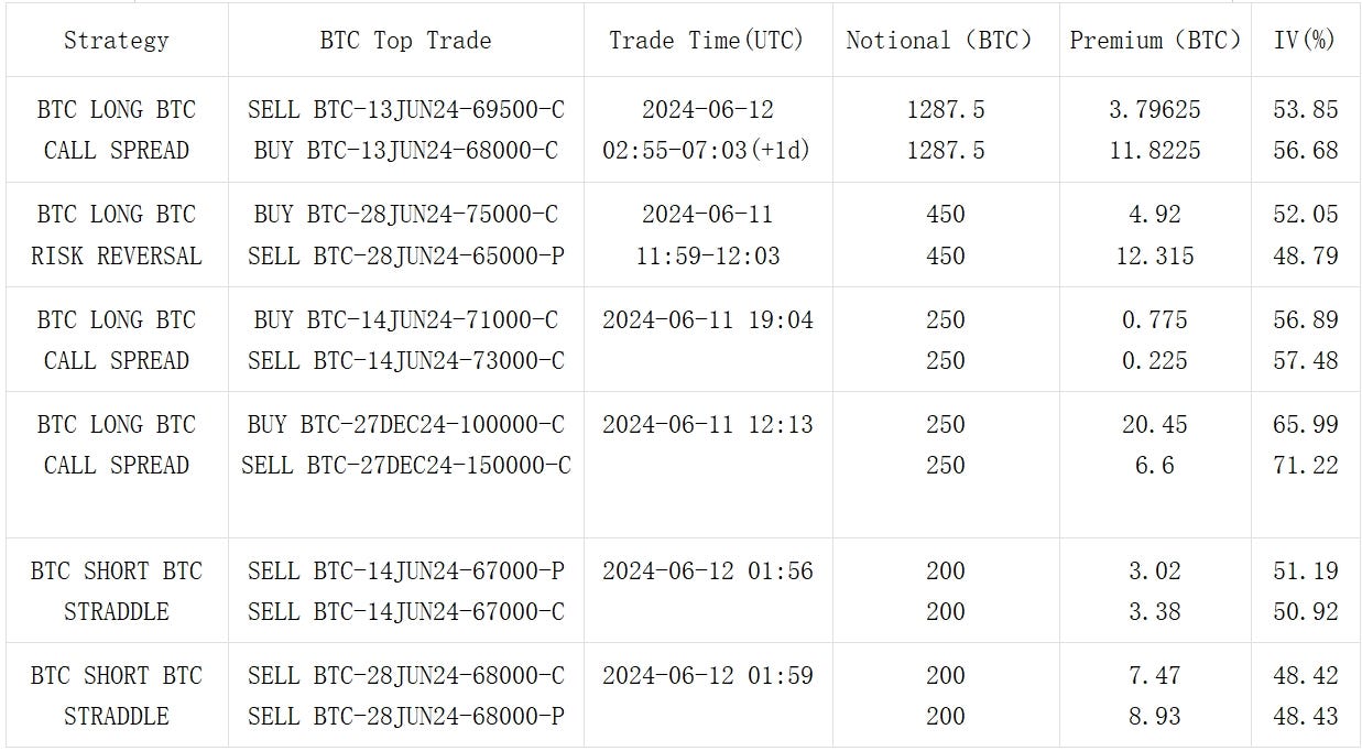 期权方面,前端 IV 在美国经济事件逐步临近之际大幅上涨,远端也被微微上调。交易方面,在价格反弹,Vol Skew 偏低以及 IV 大涨的行情下,昨日前端并未延续买 Put 的 Flow,相反,大量看涨策略在昨日得到建仓,BTC 上较为有代表的是 13 JUN 68000 vs 69500 Call Spread(1287 BTC per leg)还有 28 JUN 65000 vs 75000 Risky(450 BTC Per leg);另一方面,The ETF Store 总裁预计 ETH Spot ETF S-1 文件将在 6 月底之前获得批准,ETH 整体看涨期权买入比例也明显提高, 25 dRR 整体上涨至零值上方,接近过去三个月的数据最高值;除此之外,在整体 IV 上行的行情下,ETH 28 JUN 24 IV 反而出现轻微下跌,主要推动因素可能是来自数笔大宗 Short Straddle 策略。